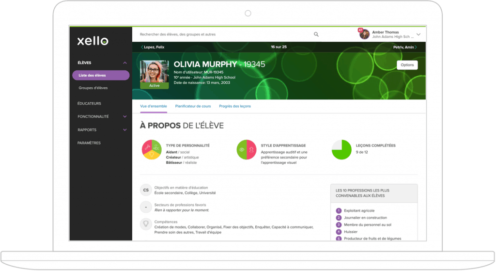 Les outils simples et puissants de Xello destinés aux éducateurs contiennent tout ce dont vous avez besoin pour aider vos élèves à se préparer pour l’avenir. Le suivi des progrès, les alertes critiques et les rapports de conformité ne sont qu’à quelques clics.